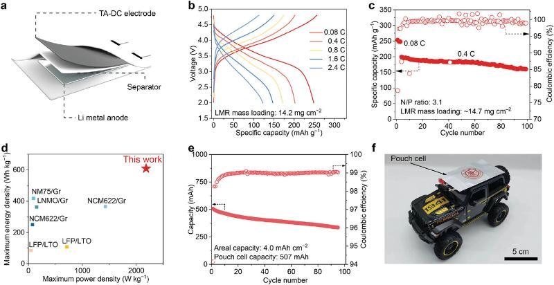 在負(fù)極/正極容量(N/P)比為3.1的條件下,使用TA-DC電極組裝了Li/LMR全電池(圖4a)。所獲得的全電池在0.08 C時(shí)的放電比容量為256 mAh g?1,并在2.4 C和4 C時(shí)具有優(yōu)異的倍率性能(圖4b)。在0.4 C下循環(huán)100圈后,容量保持率為80%,明顯高于DC電極的29%(圖4c);谡龢O和負(fù)極的總質(zhì)量,Li/LMR全電池的最大能量密度和功率密度分別為609 Wh kg?1和2183 W kg?1,與之前報(bào)道基于干法電極的鋰金屬全電池相比具備競(jìng)爭(zhēng)力(圖4d)。為了充分驗(yàn)證TA-DC電極的放大可行性,作者制備了放電容量為507 mAh的軟包電池,在95個(gè)循環(huán)后容量維持72%(圖4e),并可為玩具電動(dòng)汽車提供動(dòng)力(圖4f)。