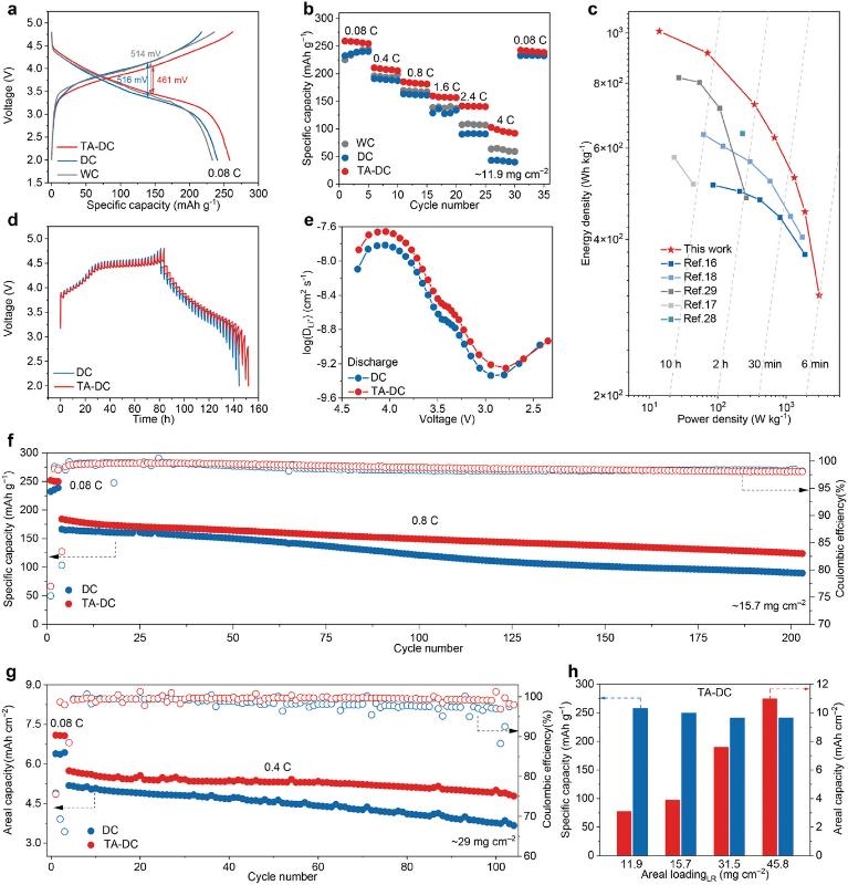 研究團(tuán)隊(duì)基于負(fù)載量為11.9 mg cm?2的濕法(WC)、干法(DC)和熱輔助干法(TA-DC)電極組裝了Li/LMR半電池,TA-DC電極在0.08 C下放電容量為258 mAh g?1(圖3a)。此外,與DC和WC電極相比,TA-DC電極的過(guò)電位也更低,僅為461 mV(圖3a)。在4 C(12 mA cm?2)的倍率下,TA-DC電極顯示出103 mAh g?1的放電比容量(圖3b),這表明TA-DC電極內(nèi)部的離子和電子傳輸更加高效。基于LMR質(zhì)量計(jì)算的最大能量密度和功率密度分別達(dá)到了1008 Wh kg?1和3042 W kg?1(圖3c)。恒電位間歇滴定技術(shù)(GITT)結(jié)果顯示,TA-DC電極的離子擴(kuò)散系數(shù)明顯高于相同放電深度下的DC電極(圖3d,e)。這些結(jié)果證明了TA-DC電極改善了離子和電子的傳輸。在LMR負(fù)載量為15.7 mg cm?2的條件下,TA-DC電極在0.8 C倍率下循環(huán)200圈后容量保持率為68%,而DC電極的容量保持率僅為54%(圖3f)。當(dāng)LMR的質(zhì)量負(fù)載增加到29 mg cm?2時(shí),TA-DC電極在0.4 C下循環(huán)100次后的容量保持率也高達(dá)85%,而DC電極的容量保持率為73%(圖3g)。在更苛刻的45.8 mg cm?2的LMR質(zhì)量負(fù)載(≈11.0 mAh cm?2)條件下,TA-DC電極在0.08 C時(shí)達(dá)到了240 mAh g?1的出色放電容量(圖3h)。這些結(jié)果驗(yàn)證了TA-DC電極即使在高容量負(fù)載條件下也具有較高的電化學(xué)性能,展現(xiàn)出實(shí)際應(yīng)用的潛力。