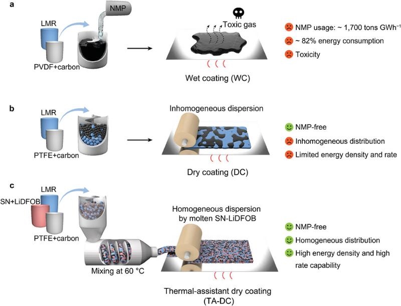 基于N-甲基吡咯烷酮(NMP)溶劑的濕法涂布(wet coating, WC)是當(dāng)前鋰離子電池正極極片制備的主流方法。盡管濕法涂布已非常成熟,然而NMP存在毒性和易燃問(wèn)題,并且在電池制備過(guò)程中用量大、烘干過(guò)程能耗大,極大影響了電池工業(yè)的環(huán)境友好性和可持續(xù)性。基于聚四氟乙烯(PTFE)粘結(jié)劑制備的干法電極,可以在剪切力的作用下形成纖維網(wǎng)絡(luò),以錨定活性材料和導(dǎo)電碳。然而,對(duì)于高能量密度的富鋰錳基(Li1.2Mn0.54Ni0.13Co0.13O2, LMR)正極的干法極片制備,尤其是面向?qū)嶋H應(yīng)用所需的快速充放電條件下的厚電極制備,仍然具有挑戰(zhàn)性。
