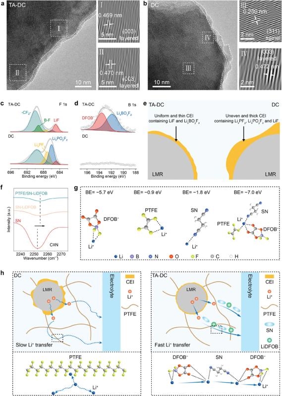 研究團(tuán)隊(duì)進(jìn)一步利用高分辨率透射電子顯微鏡(HR-TEM)和X射線光電子能譜(XPS)對(duì)TA-DC電極的正極-電解質(zhì)界面進(jìn)行了深入分析。結(jié)果顯示,基于TA-DC方法,在循環(huán)后的LMR顆粒表面形成了厚度約為2 nm的均勻界面層,并且LMR的原始晶體結(jié)構(gòu)在循環(huán)過(guò)程中得到較好保持(圖5a)。而對(duì)于傳統(tǒng)干法電極,在循環(huán)后的LMR顆粒表面觀察到了厚而不均勻的界面層,并且伴隨著尖晶石結(jié)構(gòu)的出現(xiàn)(圖5b)。對(duì)于循環(huán)50次后的TA-DC電極,F(xiàn) 1s光譜表明形成了富含LiF的界面層(圖5c)。相比之下,傳統(tǒng)干法電極的LiF含量較低,但LixPOyFz和LixPFy的含量較高。上述結(jié)果表明在電池循環(huán)過(guò)程中,電極/電解液界面上的LiPF6發(fā)生了嚴(yán)重分解(圖5d)。傅立葉變換紅外光譜(FT-IR)和密度泛函理論(DFT)計(jì)算進(jìn)一步證實(shí)Li+與C≡N之間存在配位,這可能會(huì)促進(jìn)Li+與DFOB?的解離,從而增強(qiáng)Li+的遷移(圖5f,g)。因此,研究人員認(rèn)為SN和LiDFOB的共存可以通過(guò)豐富的官能團(tuán)(如C═O、B─F和C≡N)增強(qiáng)與Li+的相互作用,從而為L(zhǎng)i+構(gòu)建高效的傳輸通路(圖5h)。