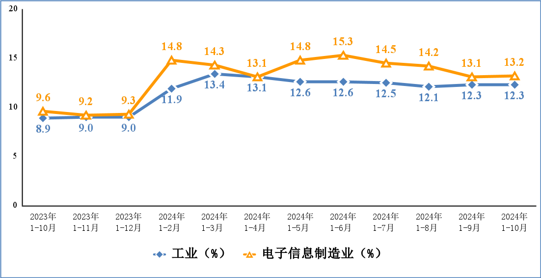 1-10月,電子信息制造業(yè)固定資產(chǎn)投資同比增長13.2%,較1-9月提高0.1個百分點,比同期工業(yè)、高技術(shù)制造業(yè)投資增速分別高0.9個和4.4個百分點。