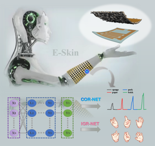 近日,中國科學(xué)院重慶綠色智能技術(shù)研究院機(jī)器人技術(shù)與系統(tǒng)中心在《Nano Energy》期刊發(fā)表了題為“Leather-Based Printed Tactile Sensor Array for Robotic Interactive Skin”的論文。該研究發(fā)展了一種新型的皮革基微結(jié)構(gòu)表面絲網(wǎng)印刷技術(shù),制備出具有垂直梯度導(dǎo)電纖維網(wǎng)絡(luò)的陣列式電子皮膚。這種獨(dú)特的多層分級導(dǎo)電纖維網(wǎng)絡(luò)力敏結(jié)構(gòu),允許傳感器在較寬的壓力范圍(0-4.5 MPa)內(nèi)仍保持高線性度(99.30%)和高一致性(99.98%)。還具有快速響應(yīng)時(shí)間(10 ms)、快速恢復(fù)時(shí)間(<10 ms)、優(yōu)良的穩(wěn)定性(~7500循環(huán))和穩(wěn)定的動態(tài)響應(yīng)性能。同時(shí),其優(yōu)異的柔韌性使該觸覺皮革器件更好地共形貼裝于機(jī)器人體表。此外,使用了Tet-Net卷積神經(jīng)網(wǎng)絡(luò)作為骨干網(wǎng)絡(luò),結(jié)合深度可分離卷積、多尺度特征提取模塊、非對稱卷積塊等,建立了接觸物體識別殘差網(wǎng)絡(luò)(COR-Net)和基于注意力機(jī)制的交互手勢識別殘差網(wǎng)絡(luò) (IGR-Net) ,成功識別了接觸不同物體的硬度材質(zhì)用于碰撞預(yù)警,以及判斷人手交互意圖,準(zhǔn)確率分別為95%和98.48%,機(jī)器人可以根據(jù)人的交互意圖完成物體抓取和搬運(yùn)等操作。該項(xiàng)研究證實(shí)了電子皮膚技術(shù)可大大提升機(jī)器人人機(jī)交互的安全性和自然性。