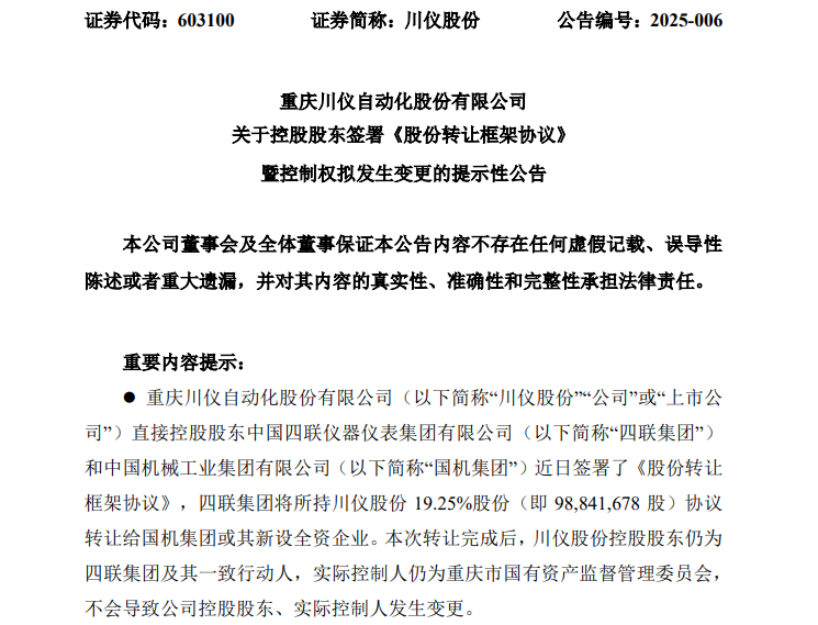 1月14日晚間,川儀股份(603100)披露公告稱,公司直接控股股東中國四聯(lián)儀器儀表集團(tuán)有限公司(以下簡稱“四聯(lián)集團(tuán)”)和中國機(jī)械工業(yè)集團(tuán)有限公司(以下簡稱“國機(jī)集團(tuán)”)近日簽署了《股份轉(zhuǎn)讓框架協(xié)議》,四聯(lián)集團(tuán)將所持川儀股份19.25%股份(即 98,841,678 股)協(xié)議轉(zhuǎn)讓給國機(jī)集團(tuán)或其新設(shè)全資企業(yè)。