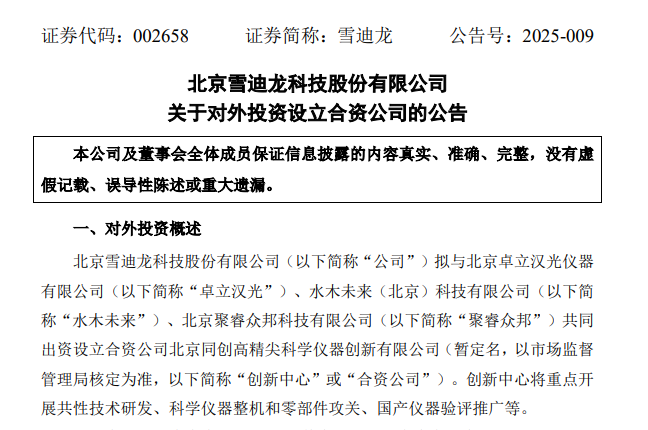 1 雪迪龍擬出資2000萬元設(shè)立合資公司 參與國產(chǎn)科學(xué)儀器平臺建設(shè)