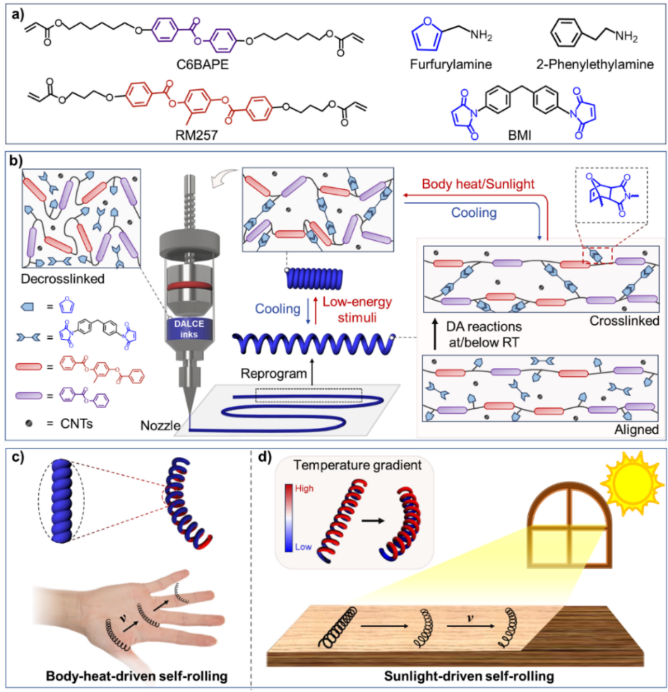 圖1.(a)用于制備低Tni DALCE的材料組分的化學結構。(b) 摻雜CNT的DALCE致動器的重新編程過程示意圖。DALCE致動器在(c)溫暖皮膚或(d)自然陽光下自持續(xù)滾動的示意圖。