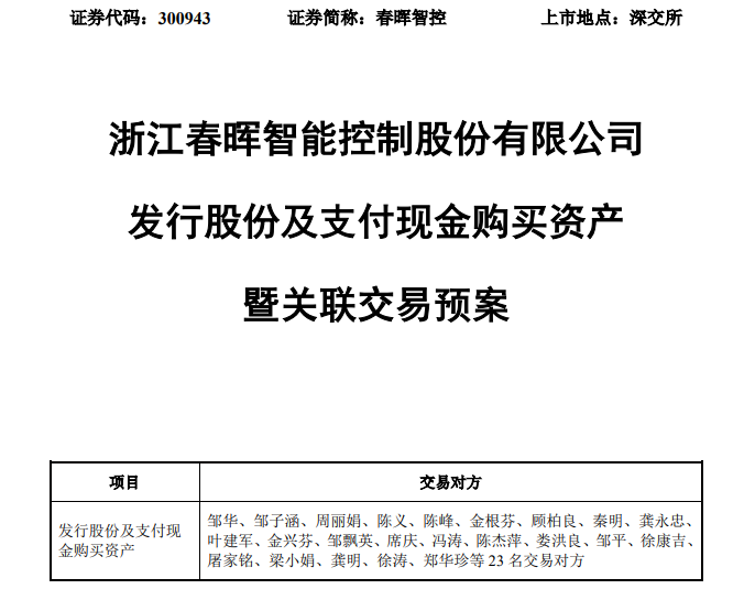 3月18日晚間,春暉智控(SZ300943)披露關聯交易預案,公司擬以發(fā)行股份和支付現金的方式,購買鄒華、鄒子涵等23名股東合計持有的浙江春暉儀表股份有限公司(以下簡稱“春暉儀表”)61.29%的股權。本次收購標的資產所需支付的資金全部來源于自有資金或合法自籌資金。
