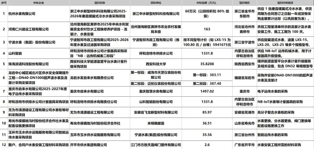 3、產(chǎn)業(yè)鏈延伸:中標(biāo)企業(yè)中不僅有水表制造商,還包括河南仁興建設(shè)工程有限公司(安裝服務(wù))、安徽省飛龍新型材料有限公司(水表柜材料)等。這表明,水表市場(chǎng)已形成一個(gè)從核心設(shè)備、到安裝施工、再到配套材料的完整產(chǎn)業(yè)鏈生態(tài)。