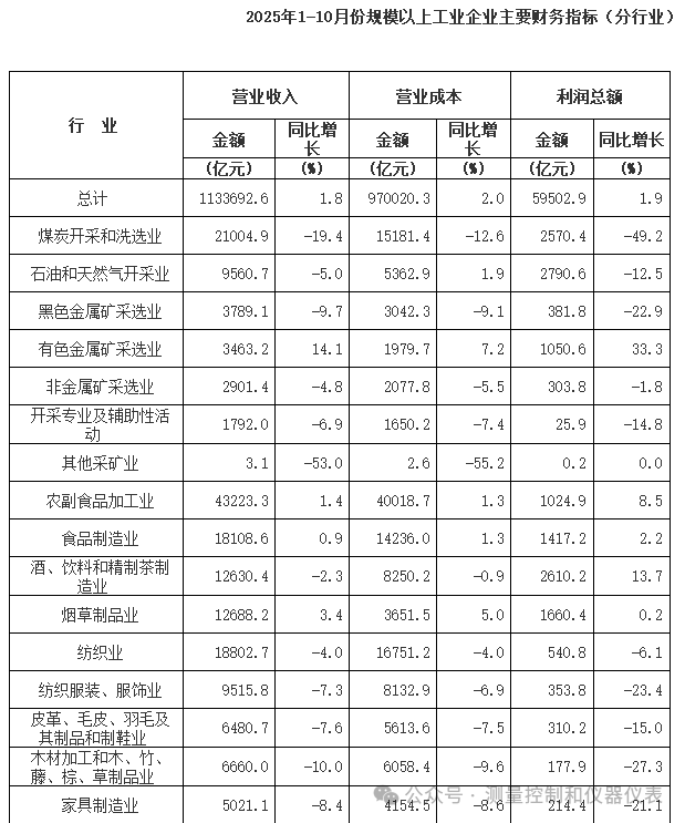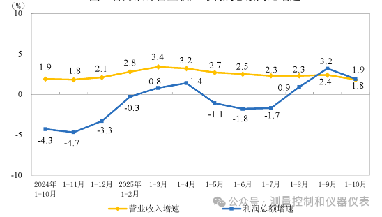 11月27日,國家統(tǒng)計(jì)局公布了2025年1-10月份全國規(guī)模以上工業(yè)企業(yè)實(shí)現(xiàn)利潤總額增長狀況。1-10月份,全國規(guī)模以上工業(yè)企業(yè)實(shí)現(xiàn)利潤總額59502.9億元,同比增長1.9%。其中,1-10月份,儀器儀表制造業(yè)營業(yè)收入8675.8億元,同比增長4.4%,實(shí)現(xiàn)利潤總額843.6億元,同比增長3.3%。