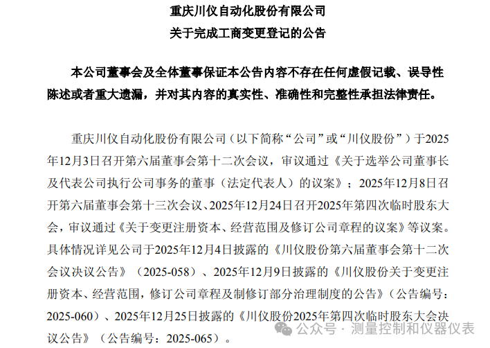 據(jù)悉,川儀股份此次變更源于公司近期的治理結(jié)構(gòu)優(yōu)化與業(yè)務(wù)發(fā)展規(guī)劃。公司先后于12月3日、12月8日召開董事會,審議通過法定代表人選舉、注冊資本及經(jīng)營范圍變更等議案,并經(jīng)12月24日第四次臨時股東大會表決通過相關(guān)事項,本次工商登記完成標志著全部流程閉環(huán)。